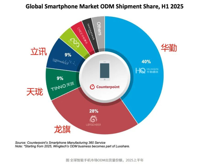 ODM,设计和制造都是由华勤/龙旗/天珑/立讯精密等厂商完成(除苹果外,各家都有在用,24年的占比就已经超过40%);