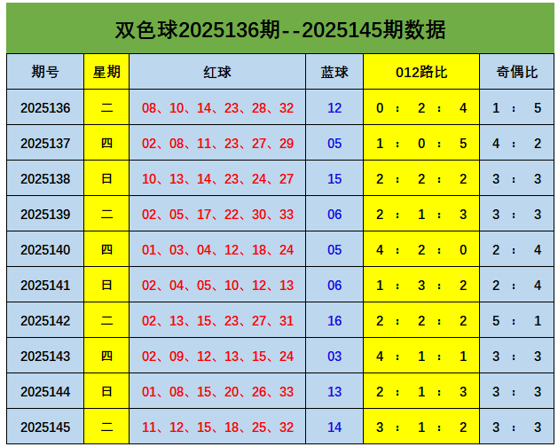 上期回顾:双色球第2025145期开出奖号:红球11、12、15、18、25、32;蓝球14,其中红球012路比为3:1:2,奇偶比3:3,蓝球开出四区号码14。