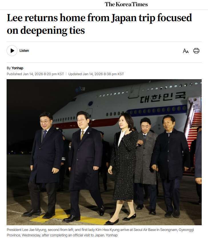 中国青年报客户端北京1月15日电(中青报·中青网记者 王梓)1月14日晚,韩国总统李在明结束了为期两天的访日行程,乘专机回国。据韩联社、《韩民族日报》、日本共同社等媒体报道,李在明与日本首相高市早苗举行会谈,就双边合作事宜进行了广泛交流。