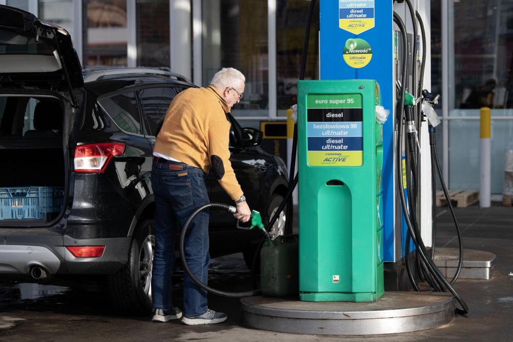 3月16日,一名来自德国的车主在波兰斯武比采的一处加油站将燃油注入油桶。新华社记者张豪夫摄