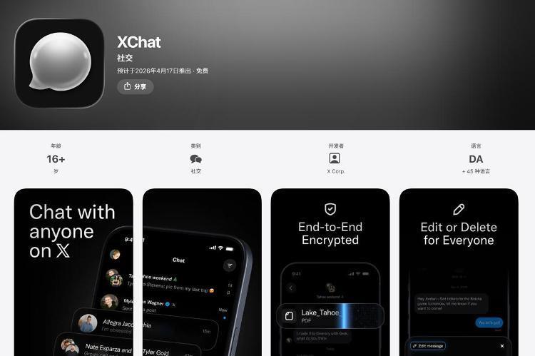 据此前报道,“XChat”的主页介绍道:该应用是专为对话打造的私密专注空间,可与X上的任何人聊天。无广告、无追踪,全程端到端加密。应用大小为175.8MB,支持iOS 26及以上系统,支持简体中文等超45种语言。
